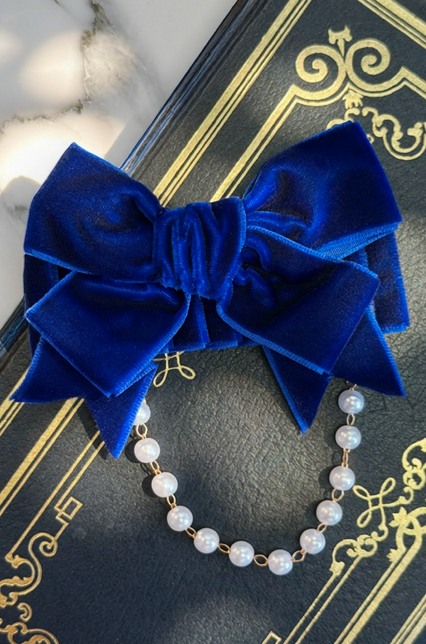 Lovingly handmade in our Brisbane studio, the Dottie Darling Hair Bow features a sumptuous blue velvet bow, finished with matching velvet trim and a softly cascading strand of pearls. It’s the kind of detail one might spot from across a room.