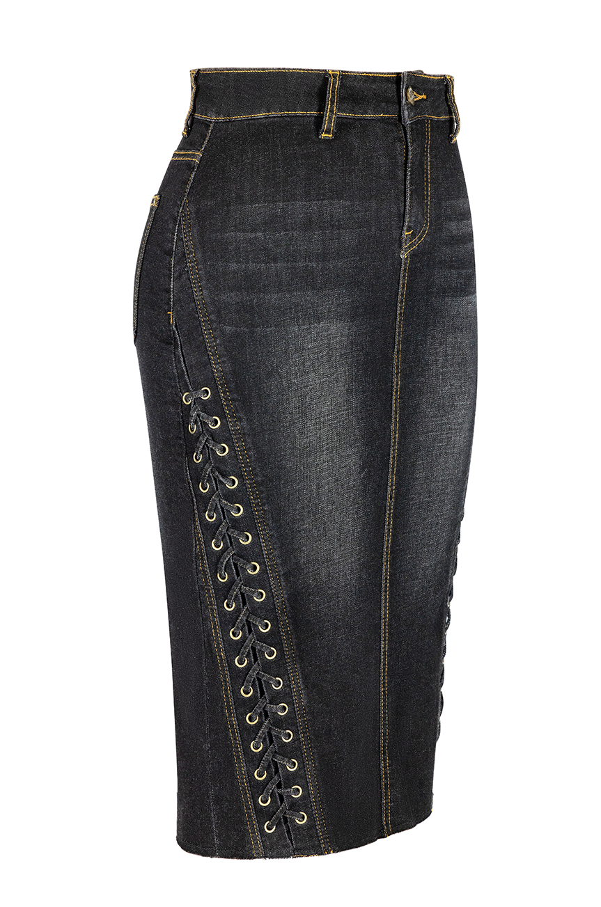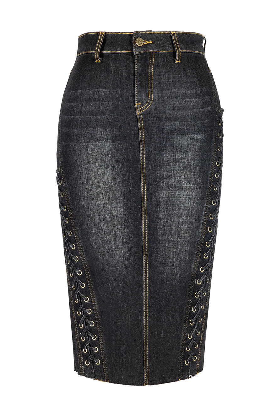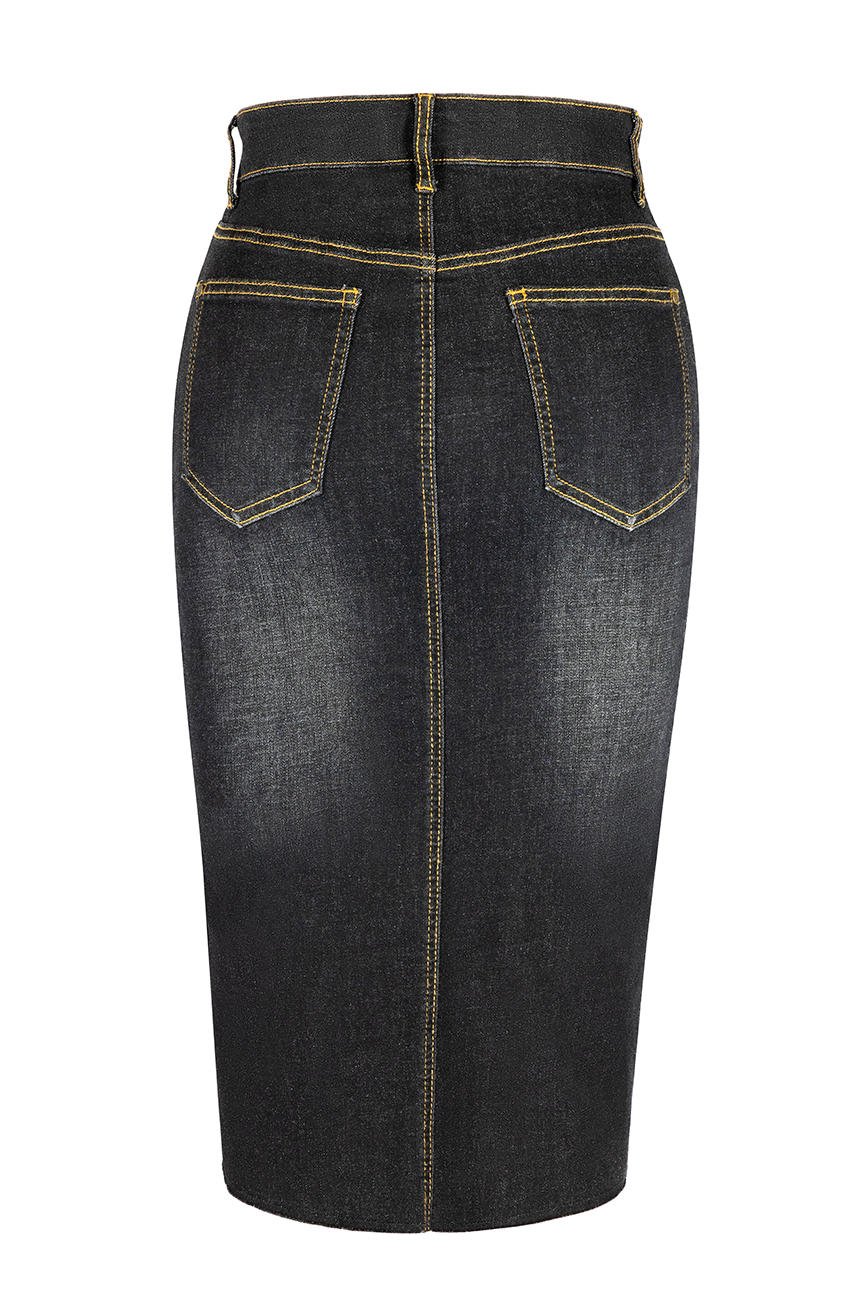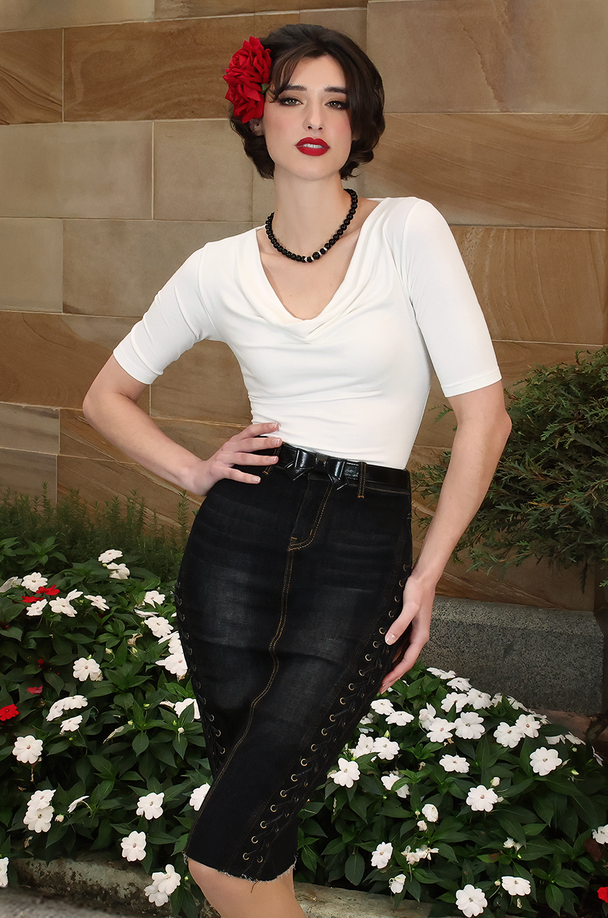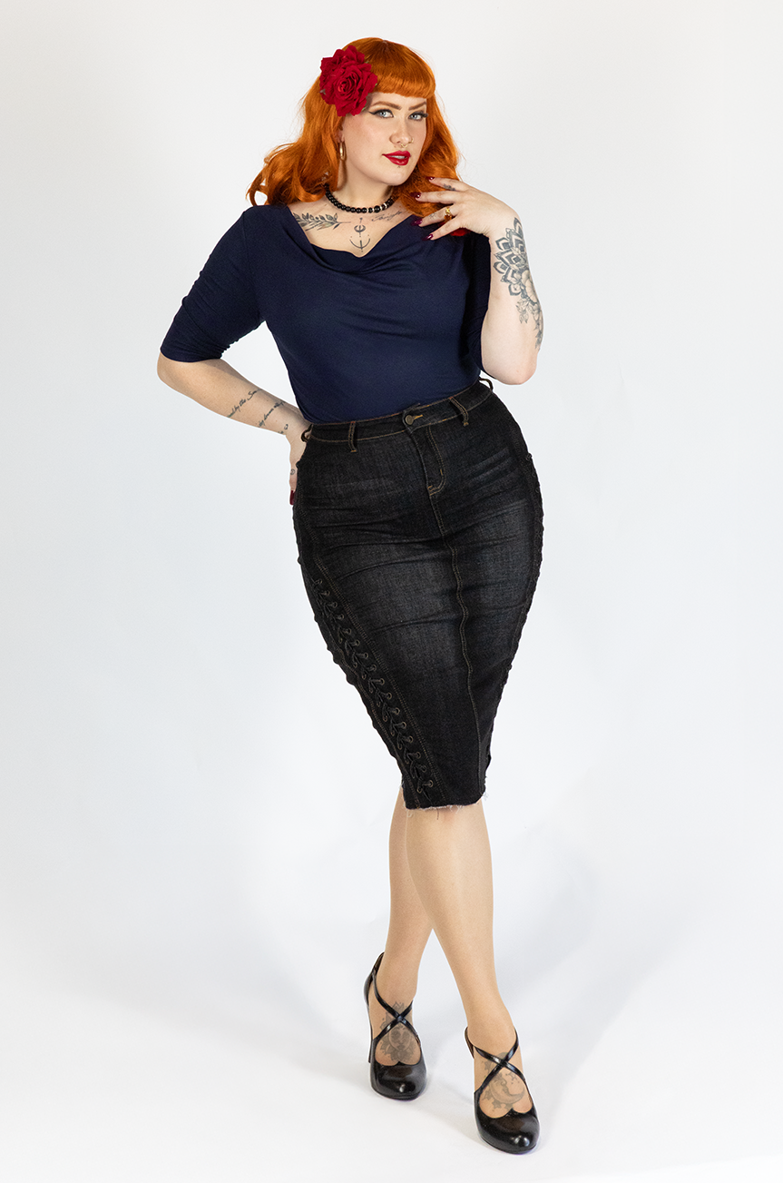 The Madison Wiggle Skirt in Black Denim is where vintage pinup glamour meets the sleek lines of a muscle car - hugging every curve in soft stretch denim while holding its shape like a dream. Falling just below the knee, she’s all about that cinched waist and bombshell silhouette.