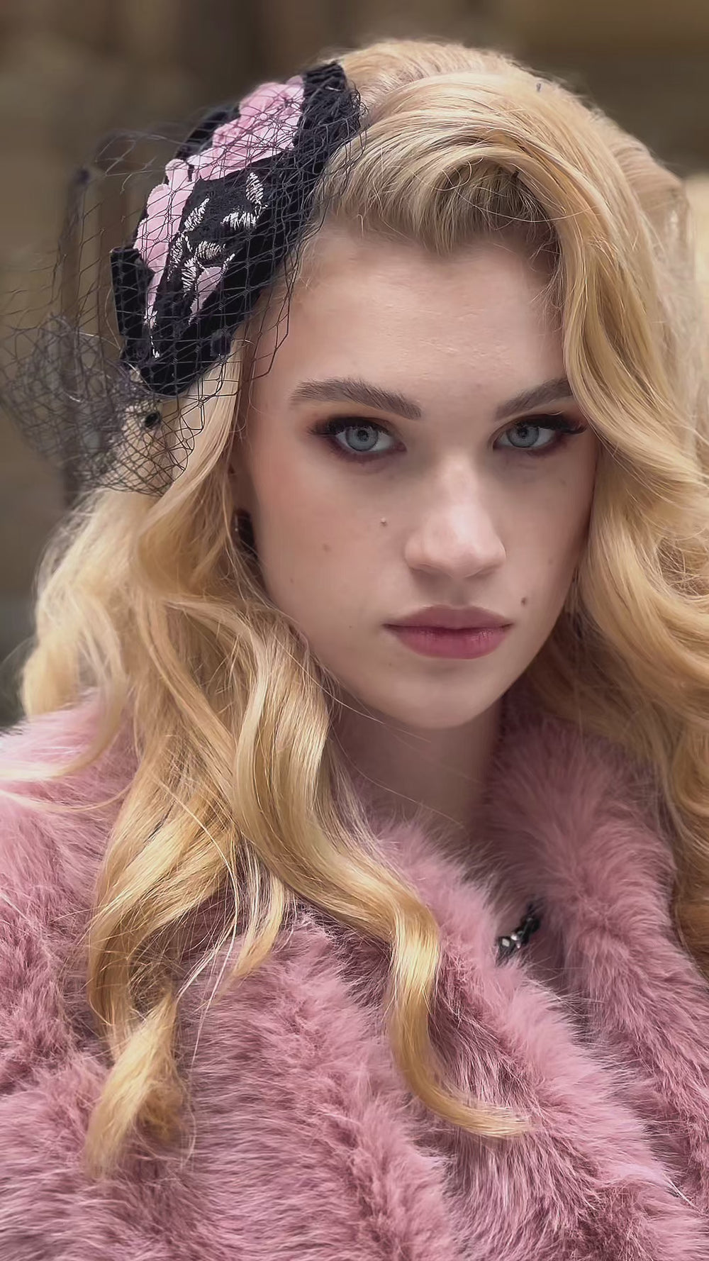 - Black velvet trim around fascinator base