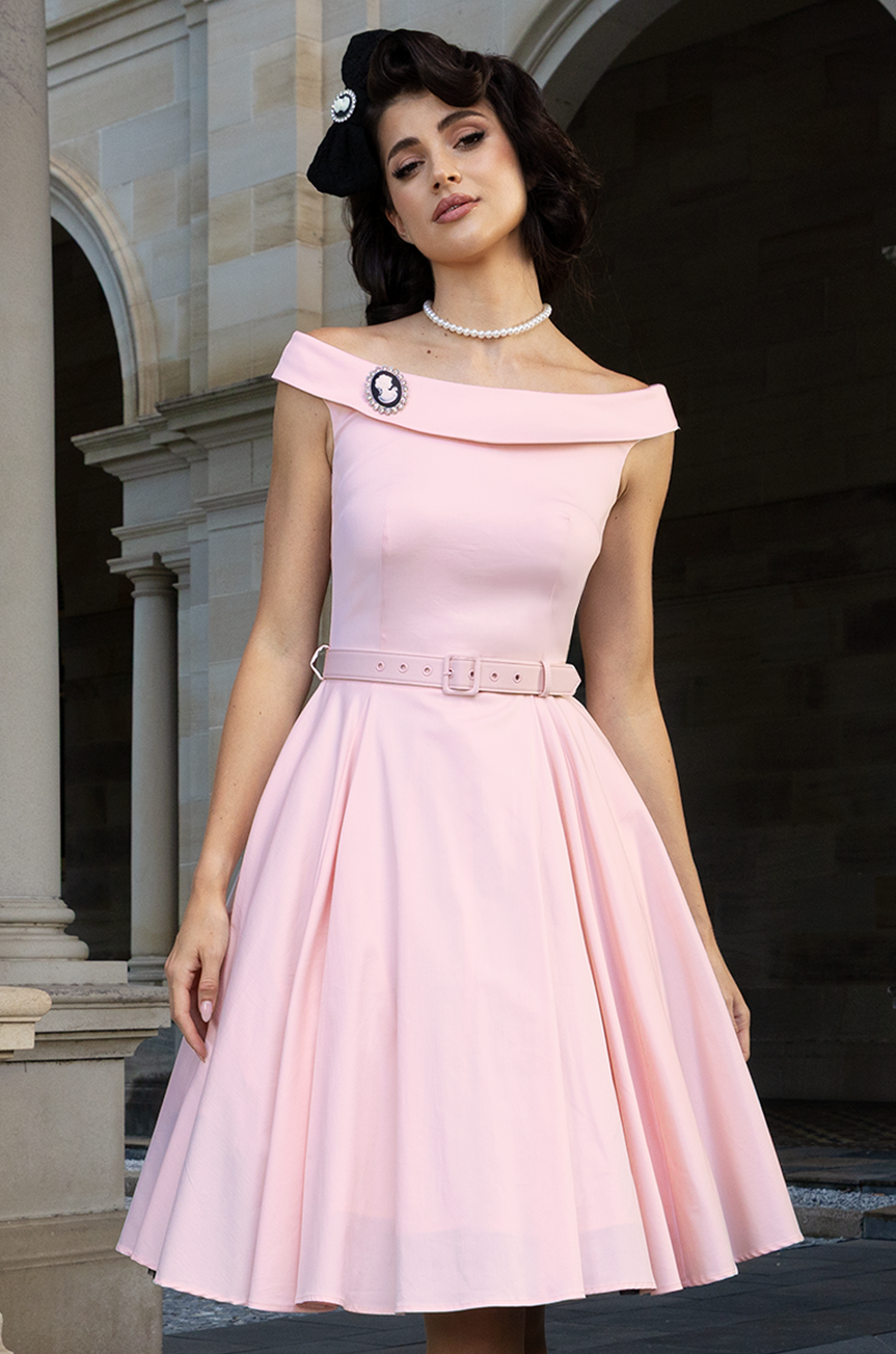 Created in the softest pale pink, the Oriana Belted Dress captures that sweet, polished charm of a 1950s ingénue - with just enough structure to feel beautifully put together. For those who prefer their romance with a little drama, she is also available in classic black.