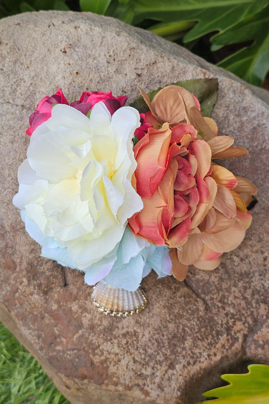 For a touch of seaside glamour, a delicate gold-dipped shell dangles beneath the flowers - a playful nod to beachside treasure and mid-century resort style. The piece secures effortlessly with a sturdy alligator clip, making it easy to nestle into victory rolls, pin beside a chignon, or crown loose, holiday-ready waves.